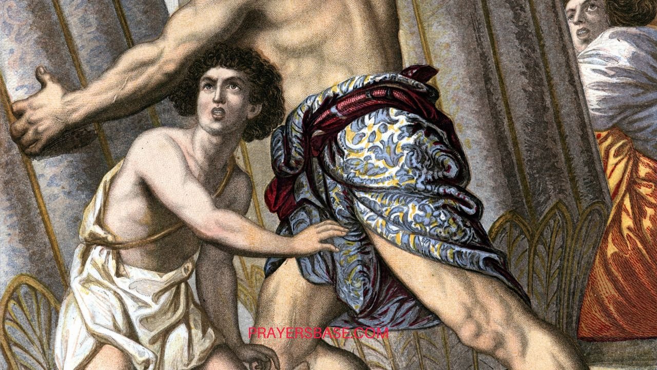 Blind and weak, Samson asks to be placed near the pillars. Then he prays.